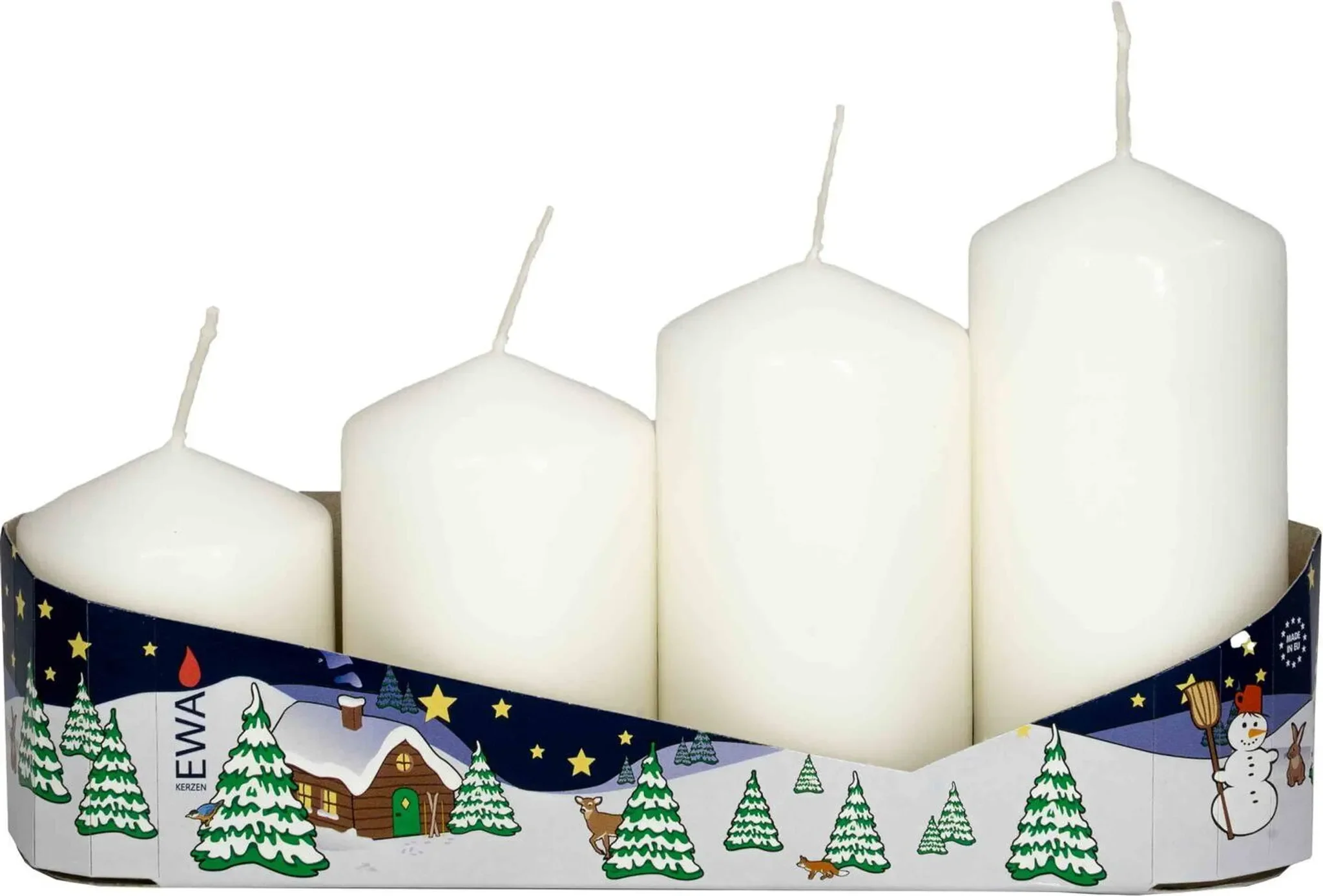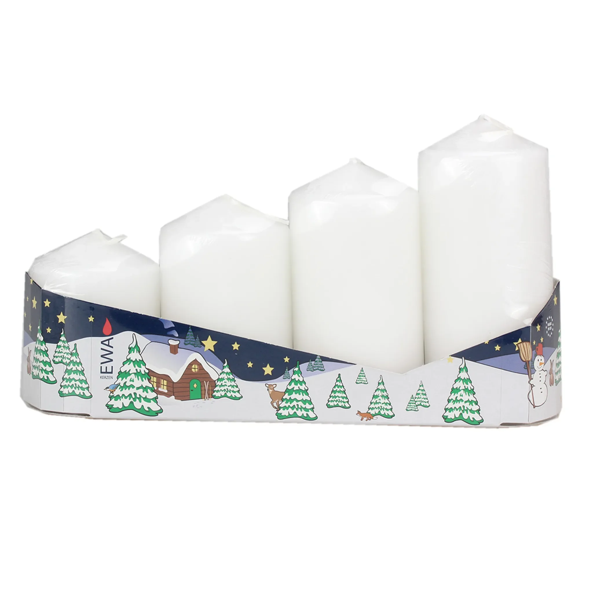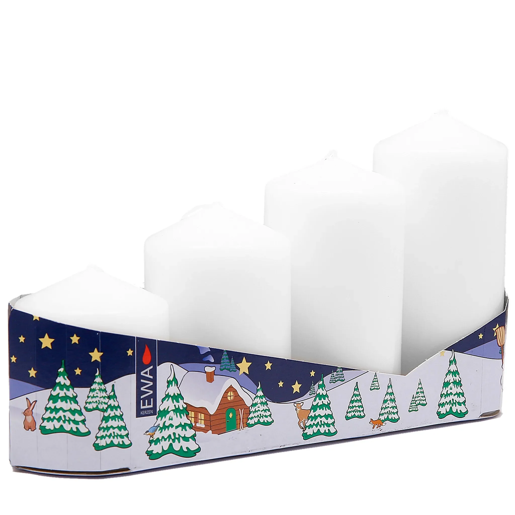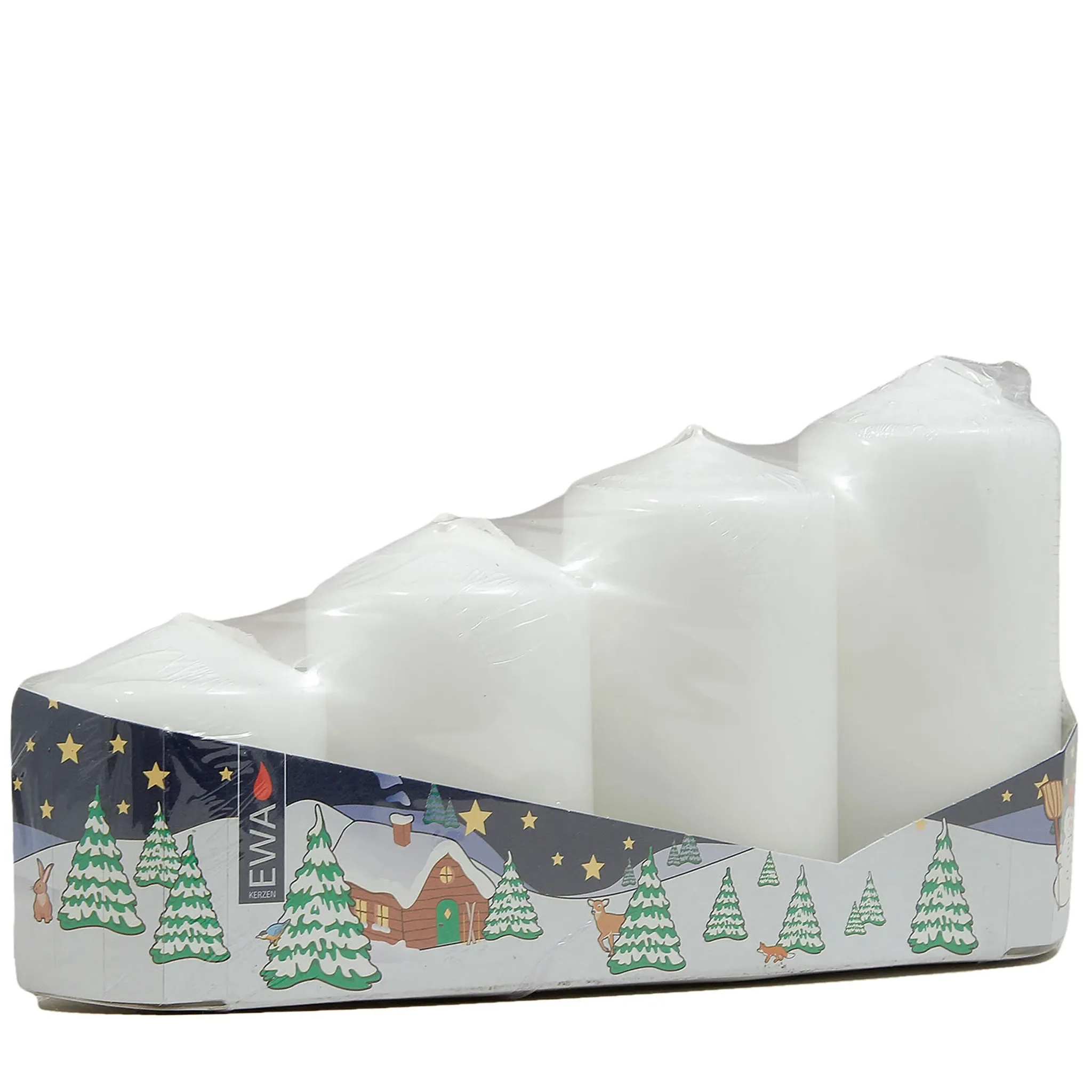 | Im Paket | 1 × 4er-Pack Stumpenkerzen (weiß) |