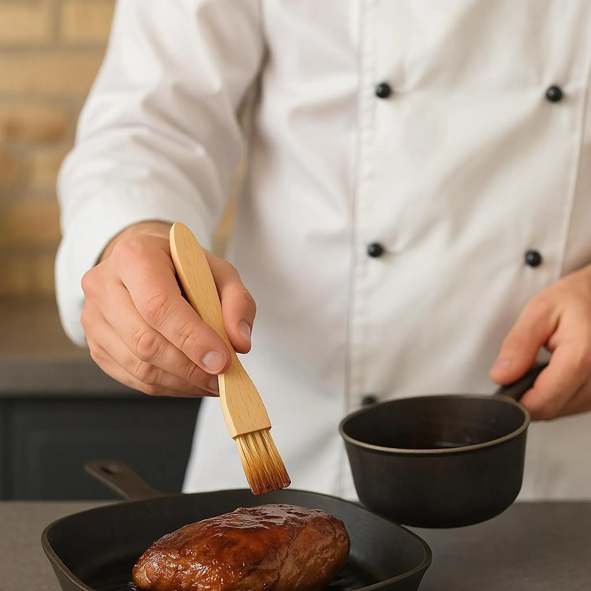 Dank der robusten Verarbeitung und des ergonomisch gestalteten Griffs liegt der Pinsel angenehm in der Hand und eignet sich auch für längere Arbeitsschritte. Ebenso praktisch ist er zum Bestreichen von Teigen mit Marinaden, Butter oder Soßen.